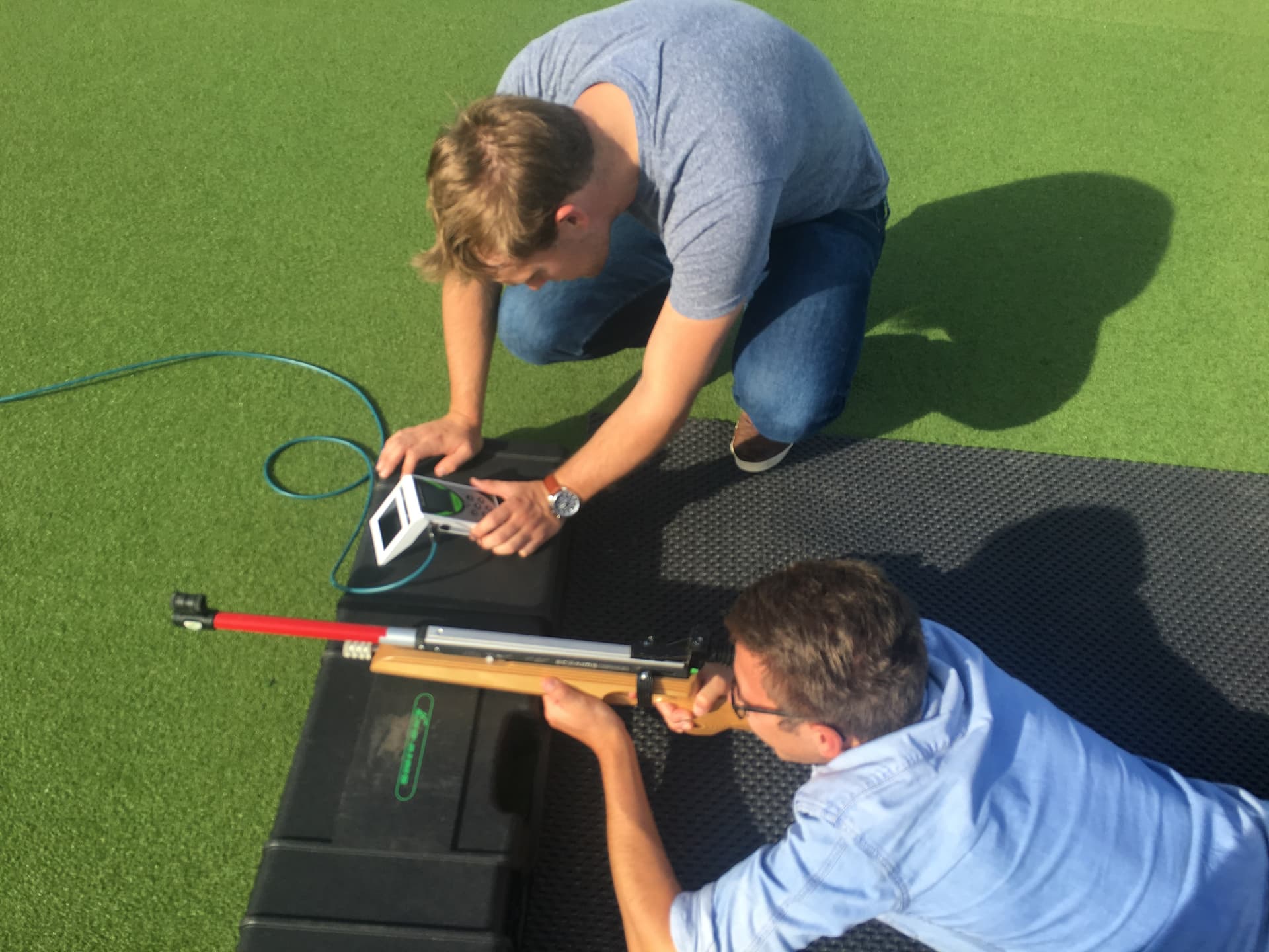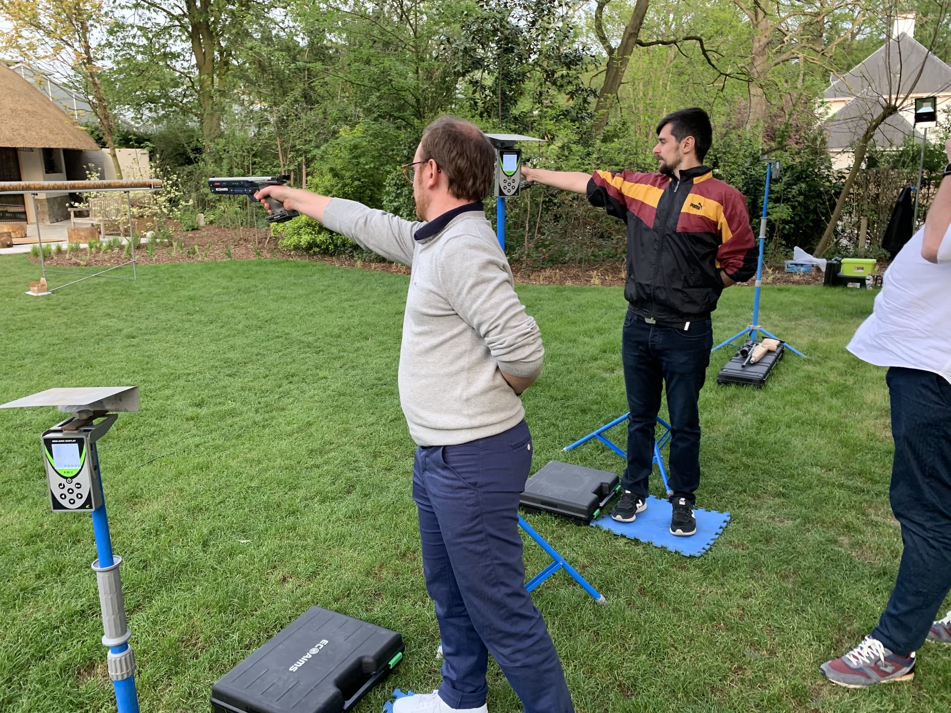 Laser clay pigeon shooting: 50m by 30m open terrain (no trees), with a minimum of 10 m² soft ground for landing the clays (meadow, football field, etc.) per system.