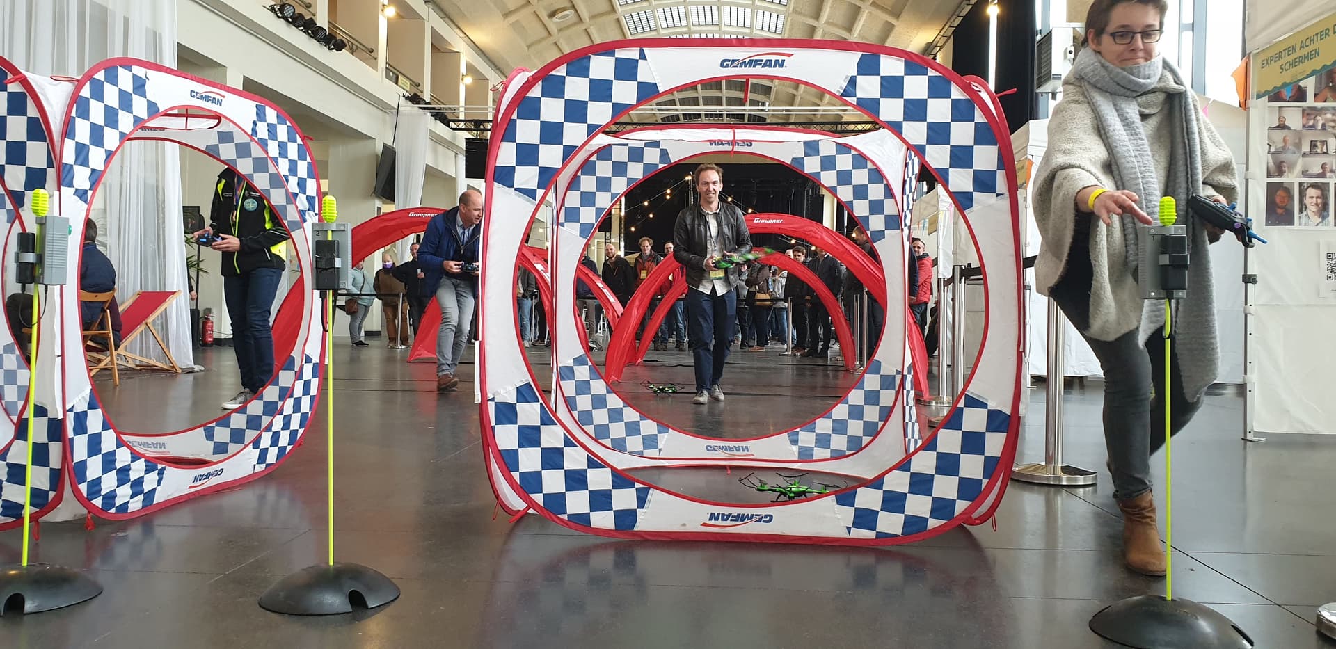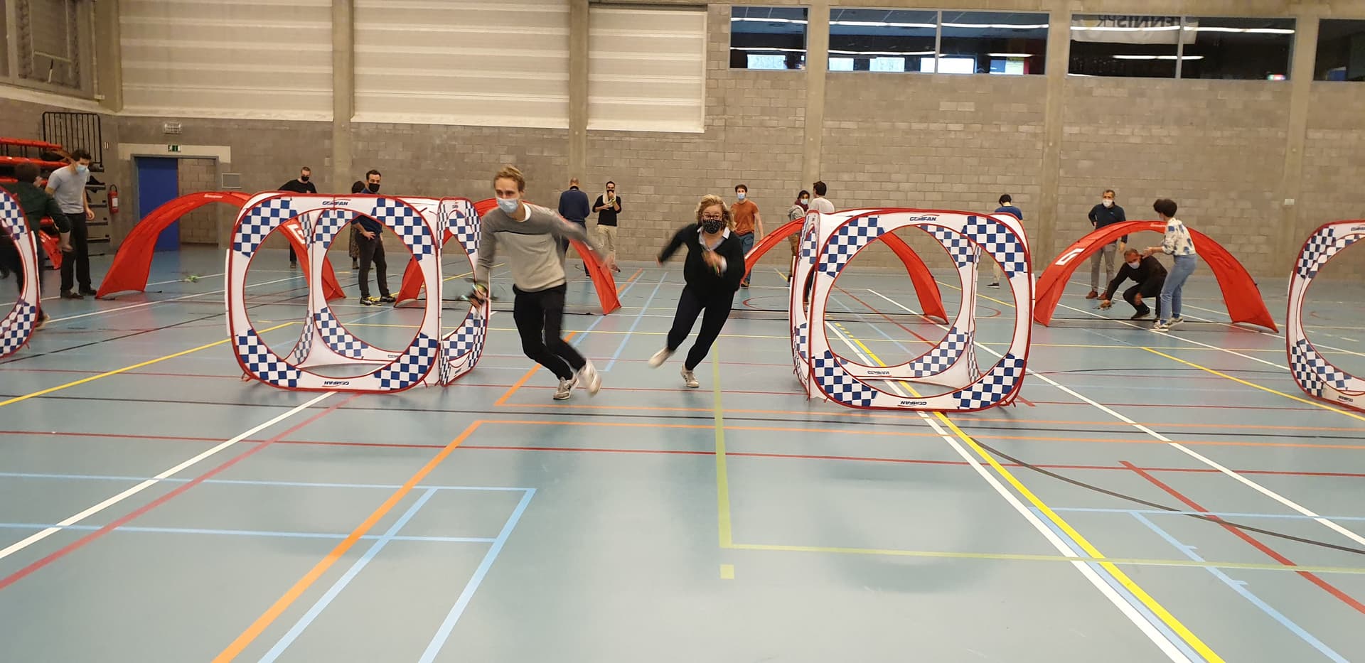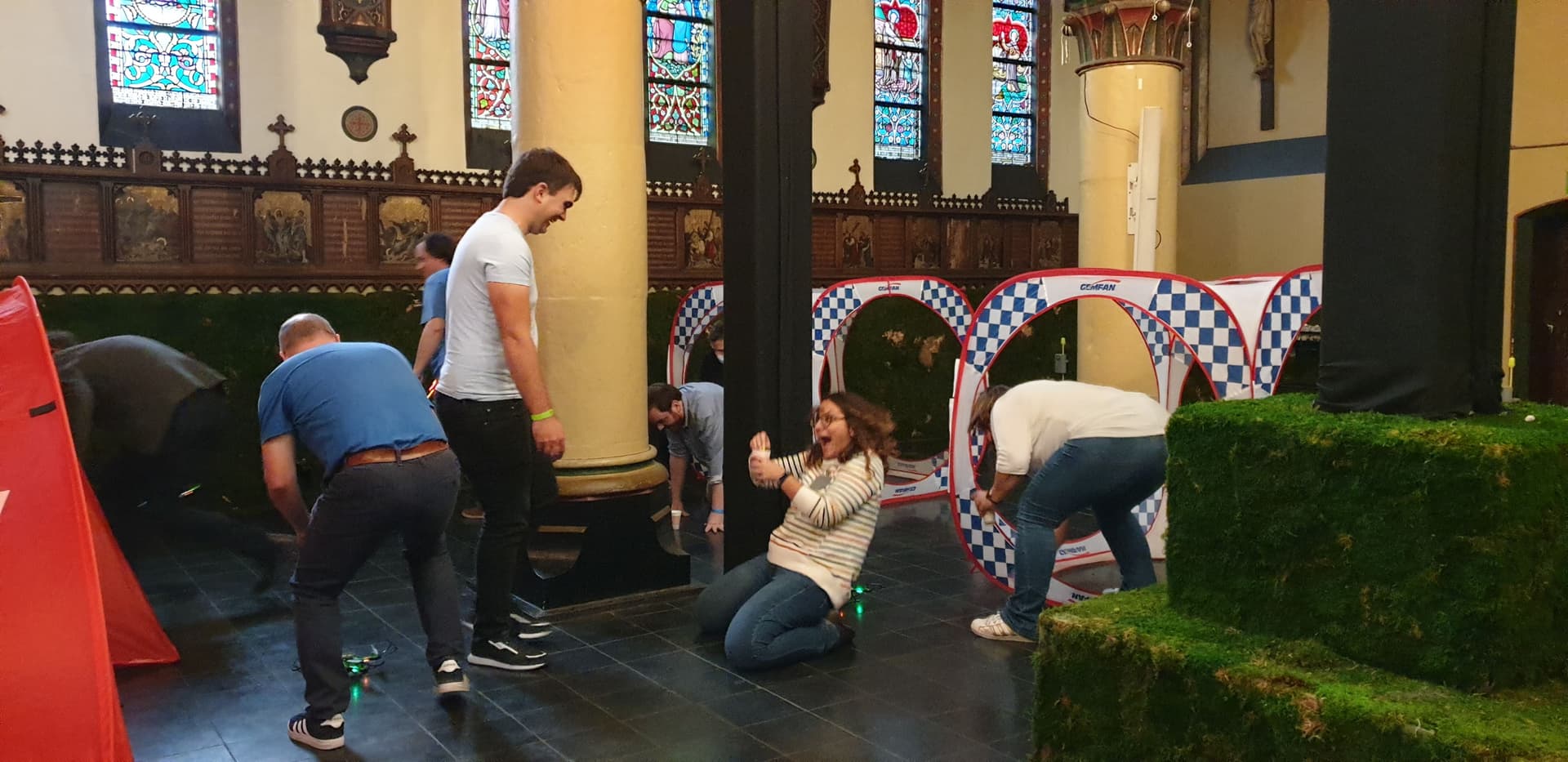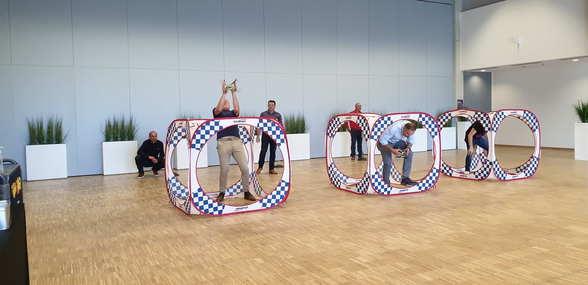 After the intense collaboration during the VR game, it's time for an adrenaline boost during the Drone fun. In the same small teams, you compete against each other in a playful sequence of varied challenges. First mission: fly through a tunnel as quickly as possible. Besides a pilot, each team also appoints a "helper," someone who helps the drone get back on track if needed. And each team also has a "runner." This is someone who, as soon as the mission is accomplished, goes to press the button of his/her team as quickly as possible, so the time for his/her team stops.