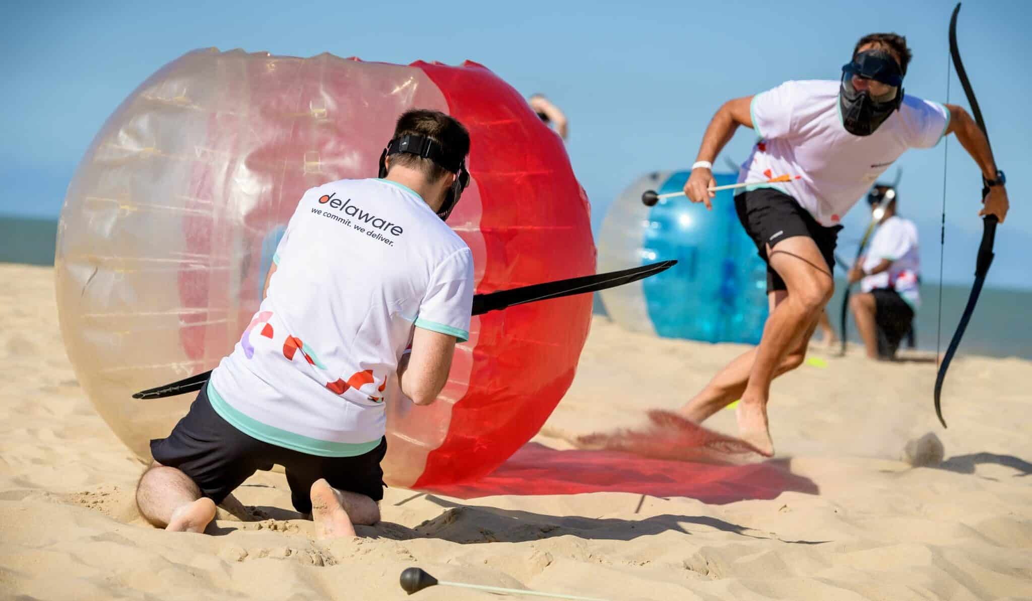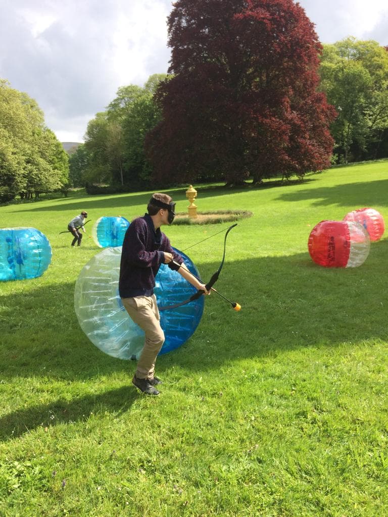 Each player receives a bow and two arrows. Everyone starts back-to-back in a circle. Once the countdown ends, players may run into the marked play area. Five seconds later, you’re allowed to start shooting at each other.