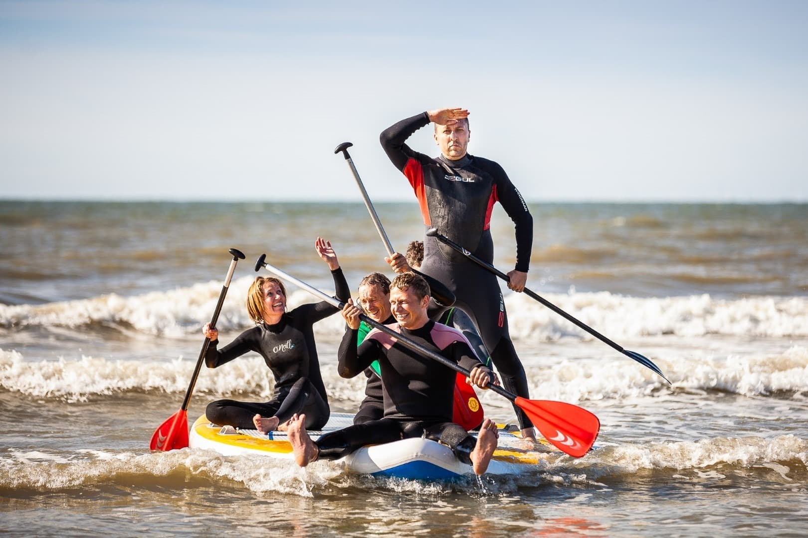 Daarna duik je met de collega’s het water in voor een surfles. We voorzien al het materiaal. Op onze gemakkelijke soft-surfboards zal je in no time de eerste golfjes afrijden. Succes verzekerd! Daarna nemen we de peddels en gaan we te water in de raft. Correct peddelen en dan leuke opdrachten zoals rechtstaan en heel snel wisselen van boot. Zwemvesten en wetsuits verzekerd, de durvers vallen misschien even over boord.