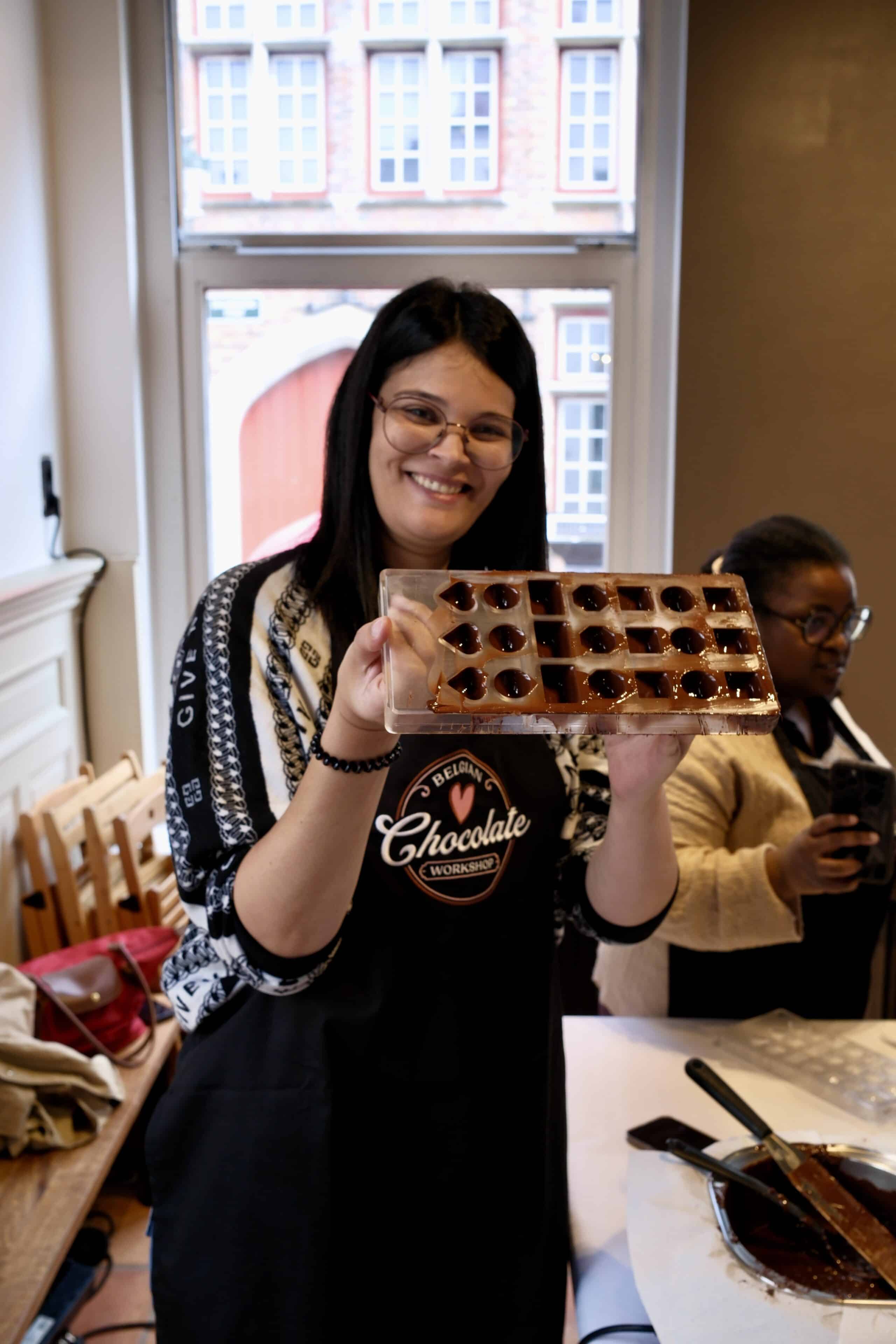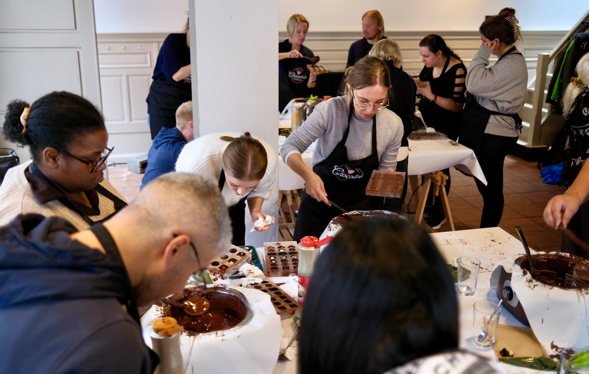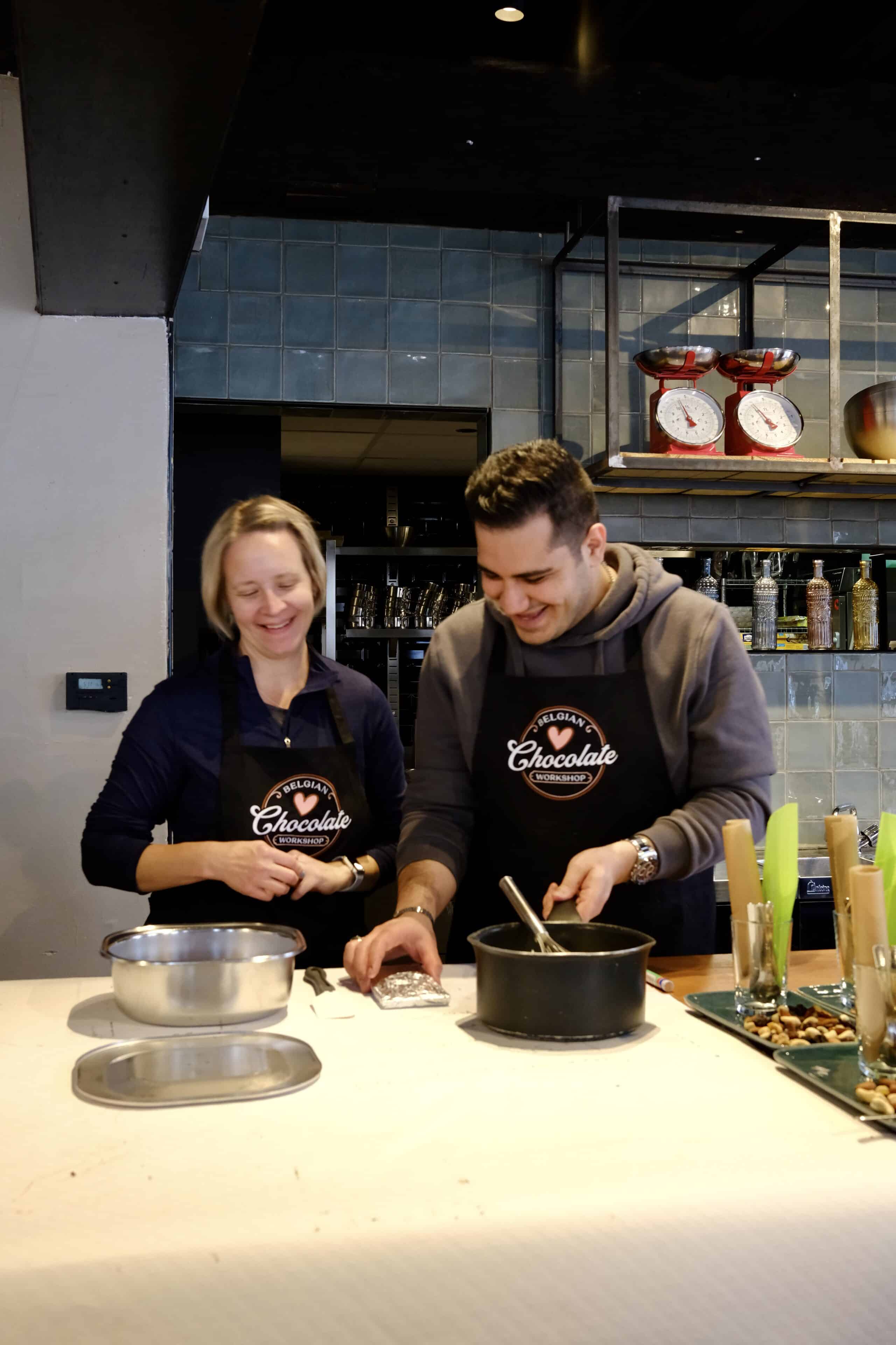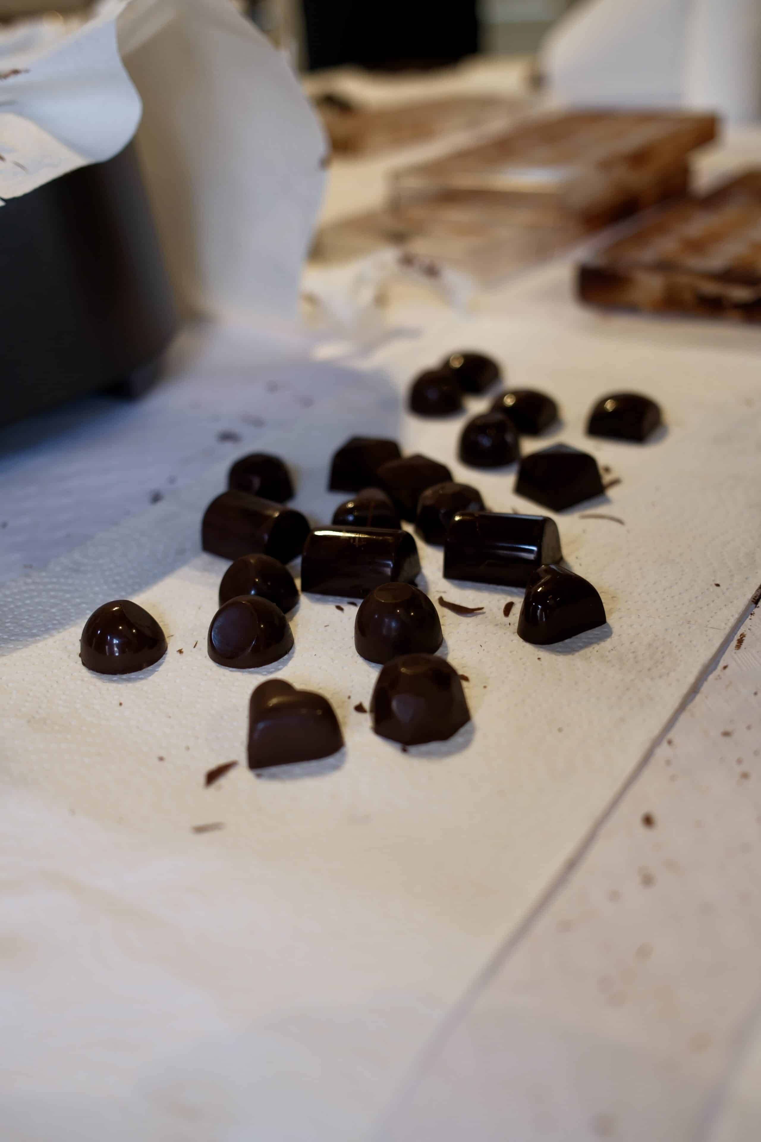 Teams van 2 of 3 worden gevormd, gevolgd door een korte uitleg over technieken voor het tempereren van chocolade voordat we aan het creatieve proces beginnen. De workshop is verdeeld in verschillende delen: te beginnen met het tempereren van de chocolade en vervolgens het vormen van de buitenste schalen van de pralines. Daarna werkt iedereen samen om chocoladegarnache voor de vulling te maken, mendiants te maken en tenslotte de pralineschalen te vullen en te sluiten. Terwijl we wachten tot de chocolade hard wordt, is er tijd om te ontspannen en te kletsen, terwijl we genieten van een van de beste warme chocolademelken ooit! Zodra de chocolade klaar is, gaan we verder met het ontvormen, proeven en verpakken van al je chocoladecreaties zodat je ze mee naar huis kunt nemen.