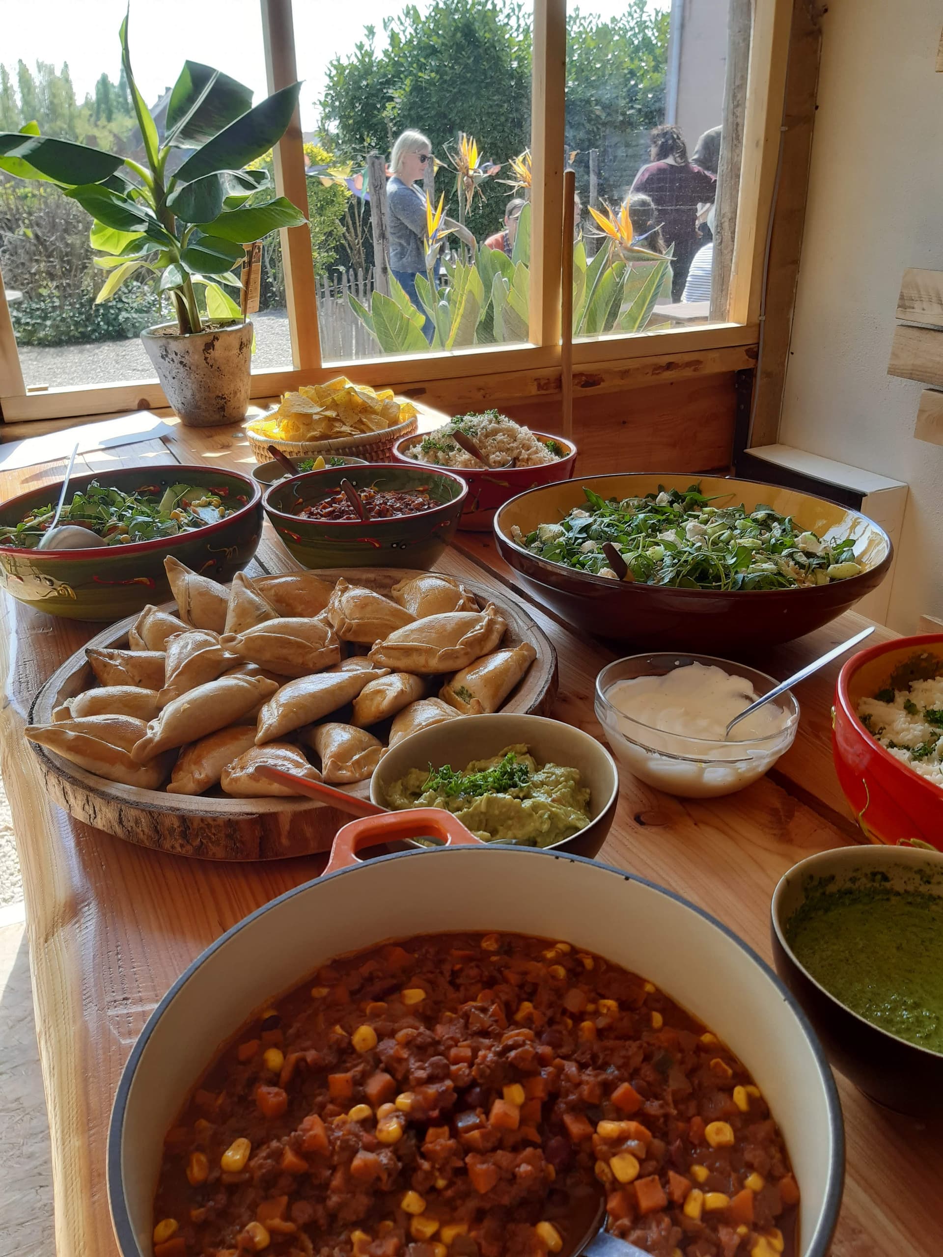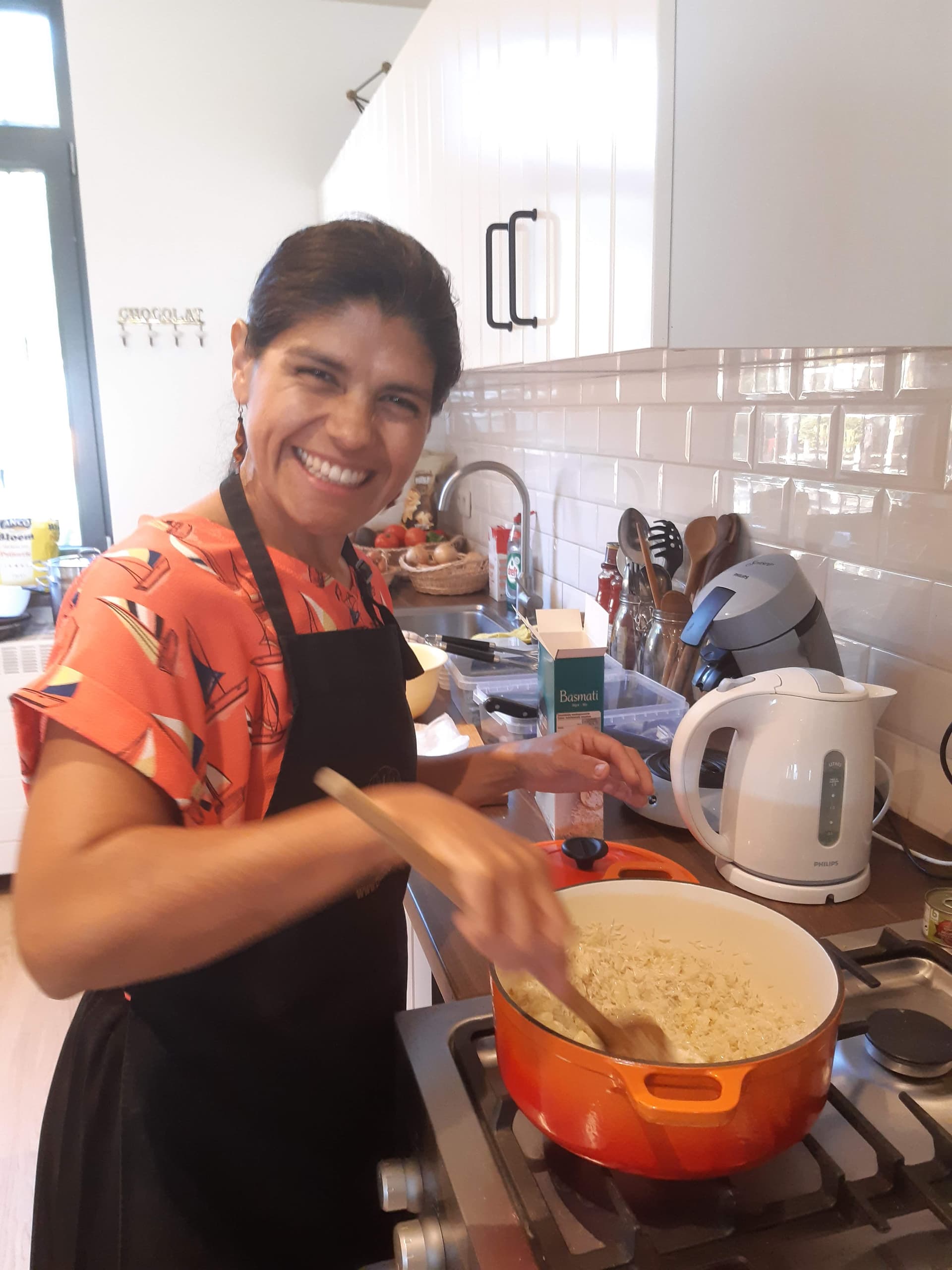 Het indekken van een gezellige tafel hoort er natuurlijk ook bij, en dat allemaal met een streepje Latijns-Amerikaanse muziek. Na verloop van tijd beginnen de geuren je tegemoet te komen en gaan we gezellig samen aan tafel.