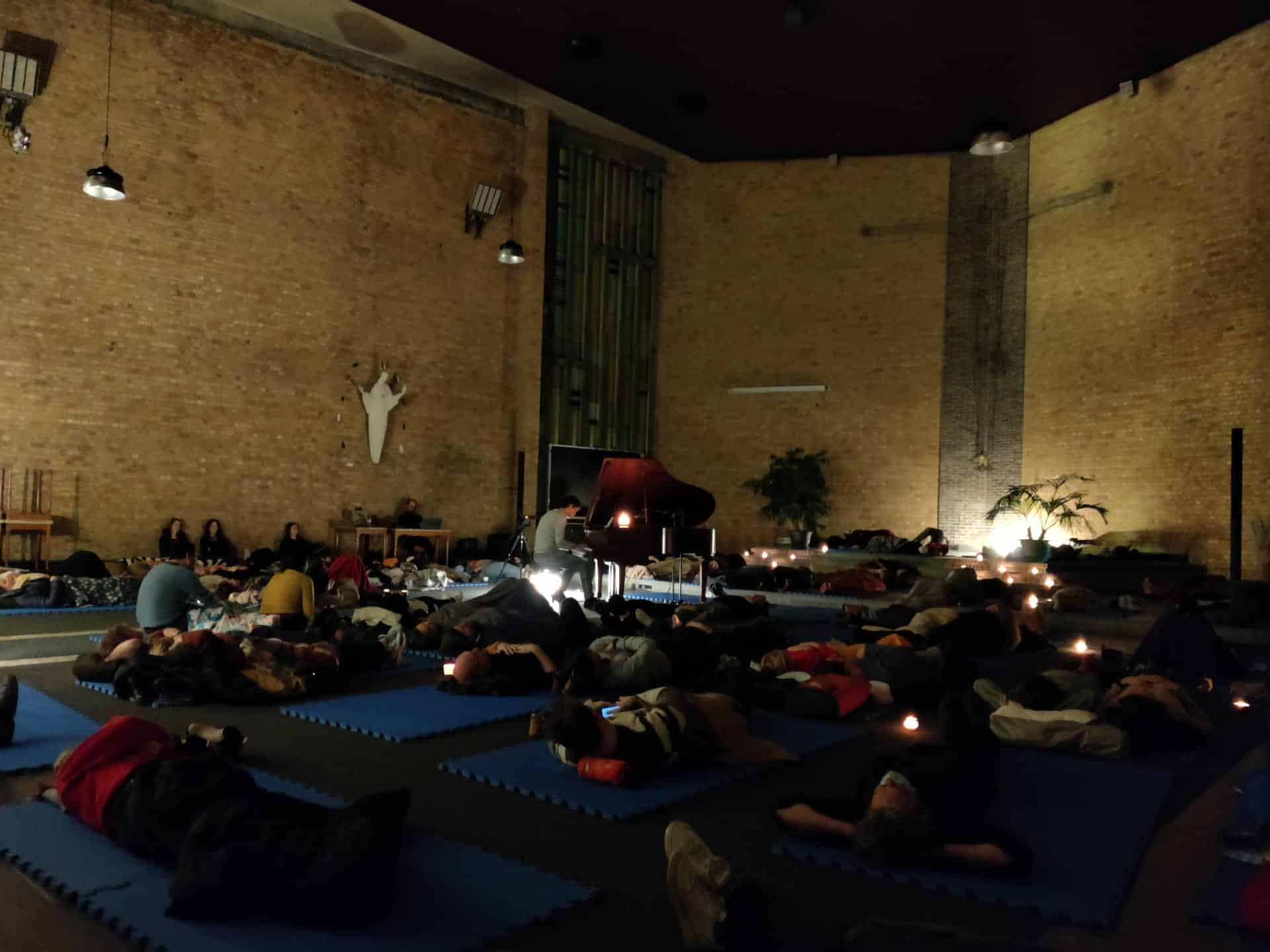 In het midden van de gekozen ruimte wordt een piano opgesteld. Iedereen installeert zich rond de piano op zijn of haar matje of luchtmatras. Anders dan tijdens een traditioneel concert met een podium, zijn er in een ligconcert in cirkelopstelling geen eerste en laatste rijen en geen vooraf vastgelegde plaatsen. De hiërarchie valt weg en elk is vrij te kiezen waar hij of zij zich het best voelt in de ruimte, beschut tegen de zijkant of in het midden.