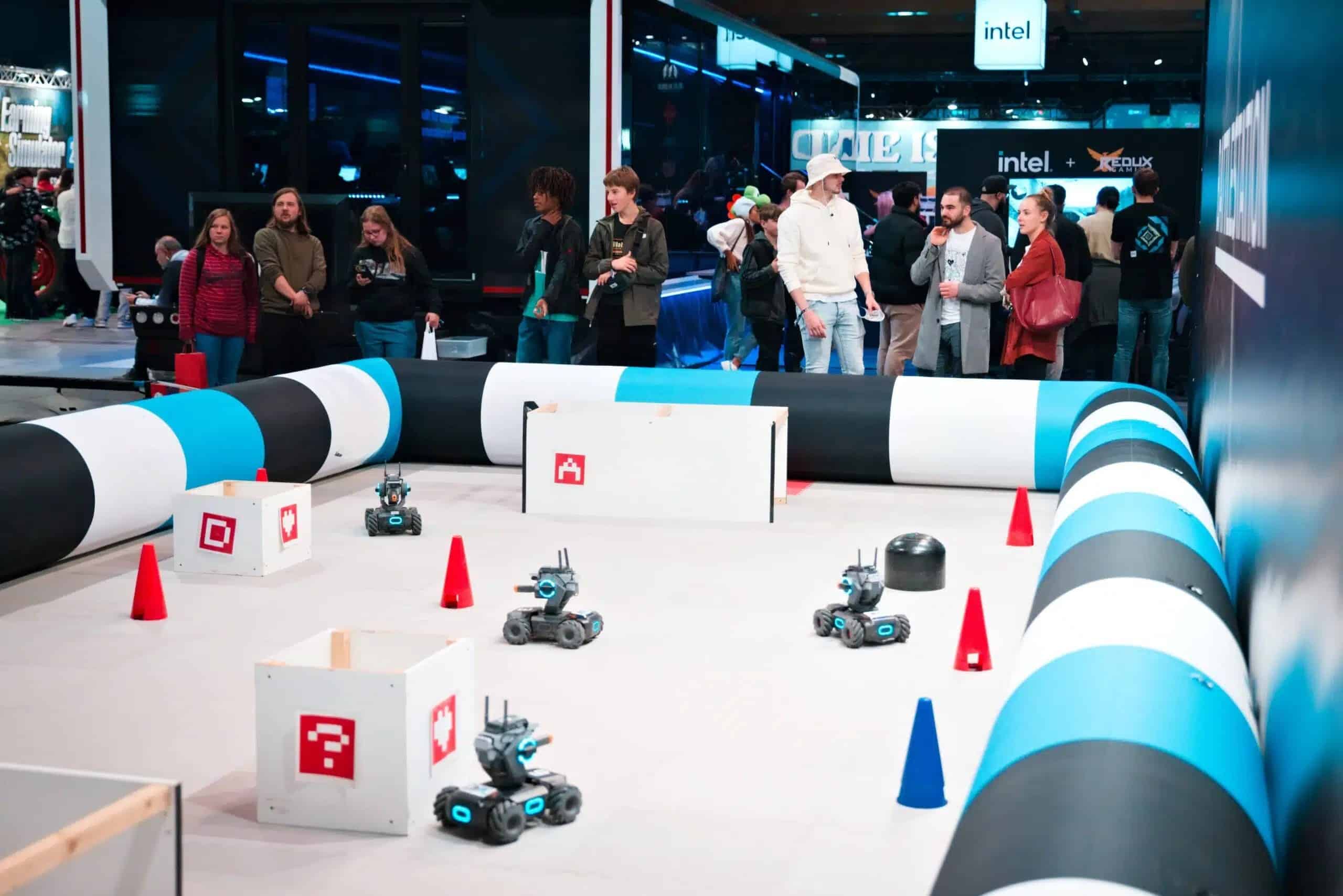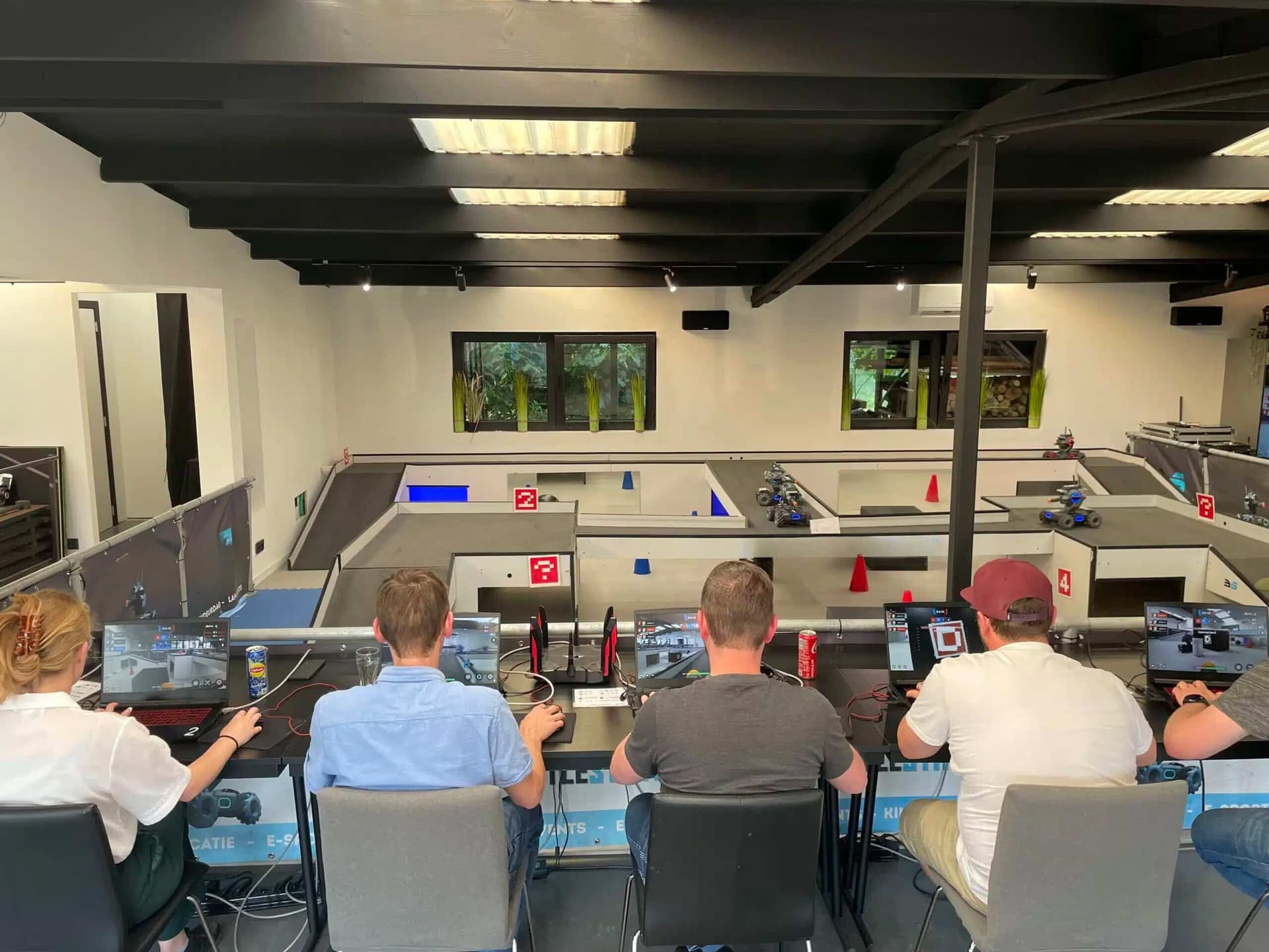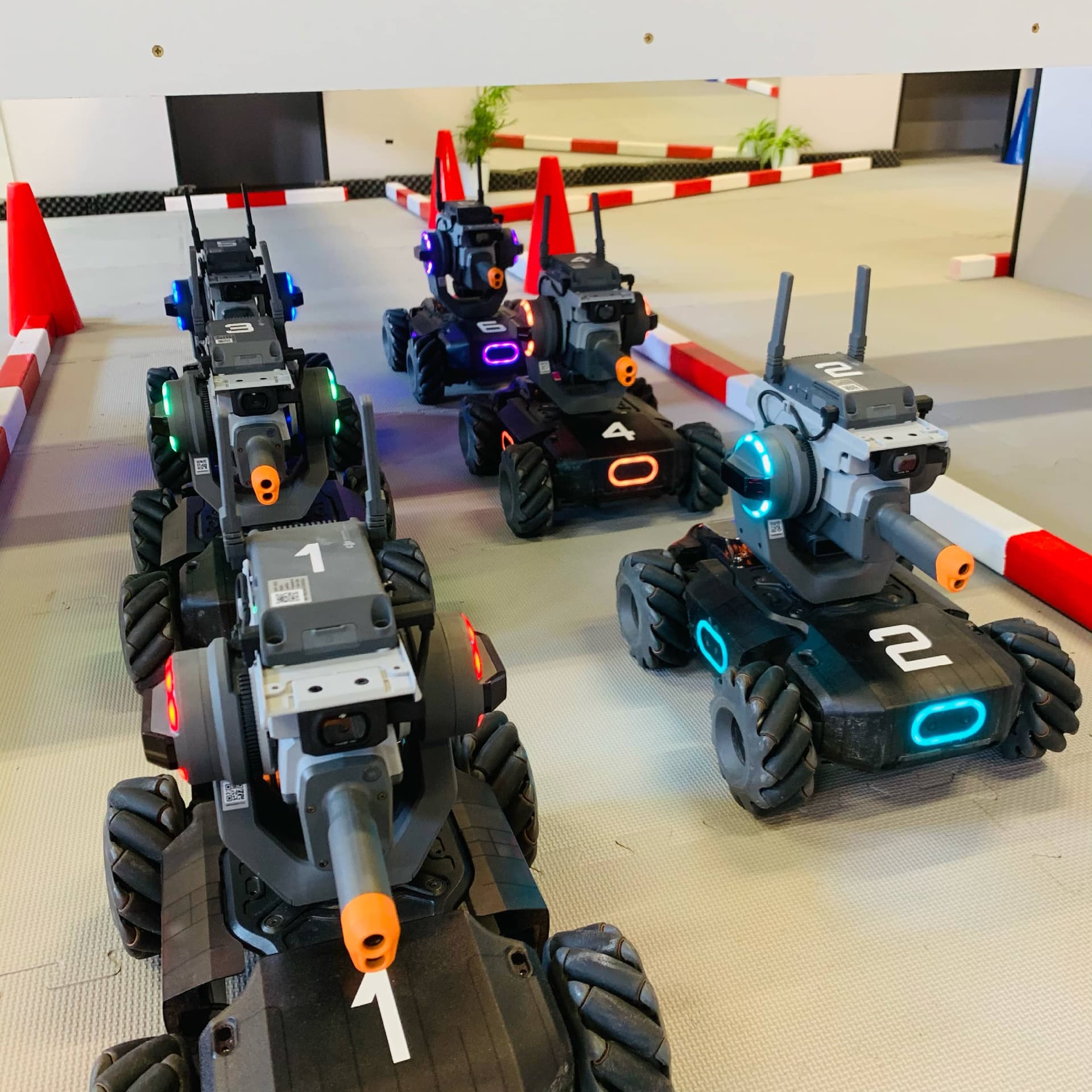 Aan de start van de activiteit krijg je een korte uitleg over wat de robots allemaal kunnen en hoe de besturing ervan werkt. Er worden 3 verschillende games gespeeld: Free For All, Race en Conquest. Beginnen doen we met een opwarmingsronde.