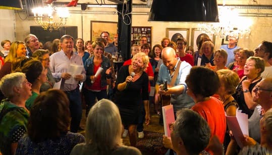 Onder het motto “Een groep klinkt nooit vals” sleurt onze opzwepende zangcoach en gitarist iedereen mee in een zaligmakende samenzang. Met haalbare arrangementen toveren ze de deelnemers in een mum van tijd om in samenhorige bende uitbundige zangers. De vedetten van deze activiteit zijn niet de aanvoerders, maar het publiek.