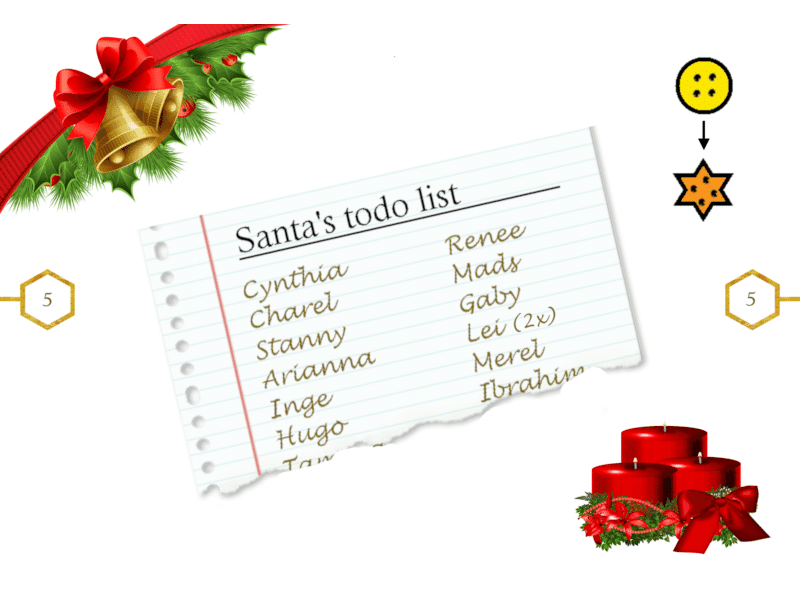 Deze activiteit bestaat uit een enveloppe of doosje met kaarten (A6 formaat) in kerst-thema. Een 10-tal raadsels leiden tot de locatie, thema en/of datum van het feestje. De raadsels kunnen als groepsactiviteit worden opgelost (groepjes van 2 tot 4 personen). Standaard is er geen begeleider voorzien. De raadsels zijn pittig, maar tips leiden naar de juiste oplossing. Voorafgaand is er overleg om de kaartenset correct te personaliseren.