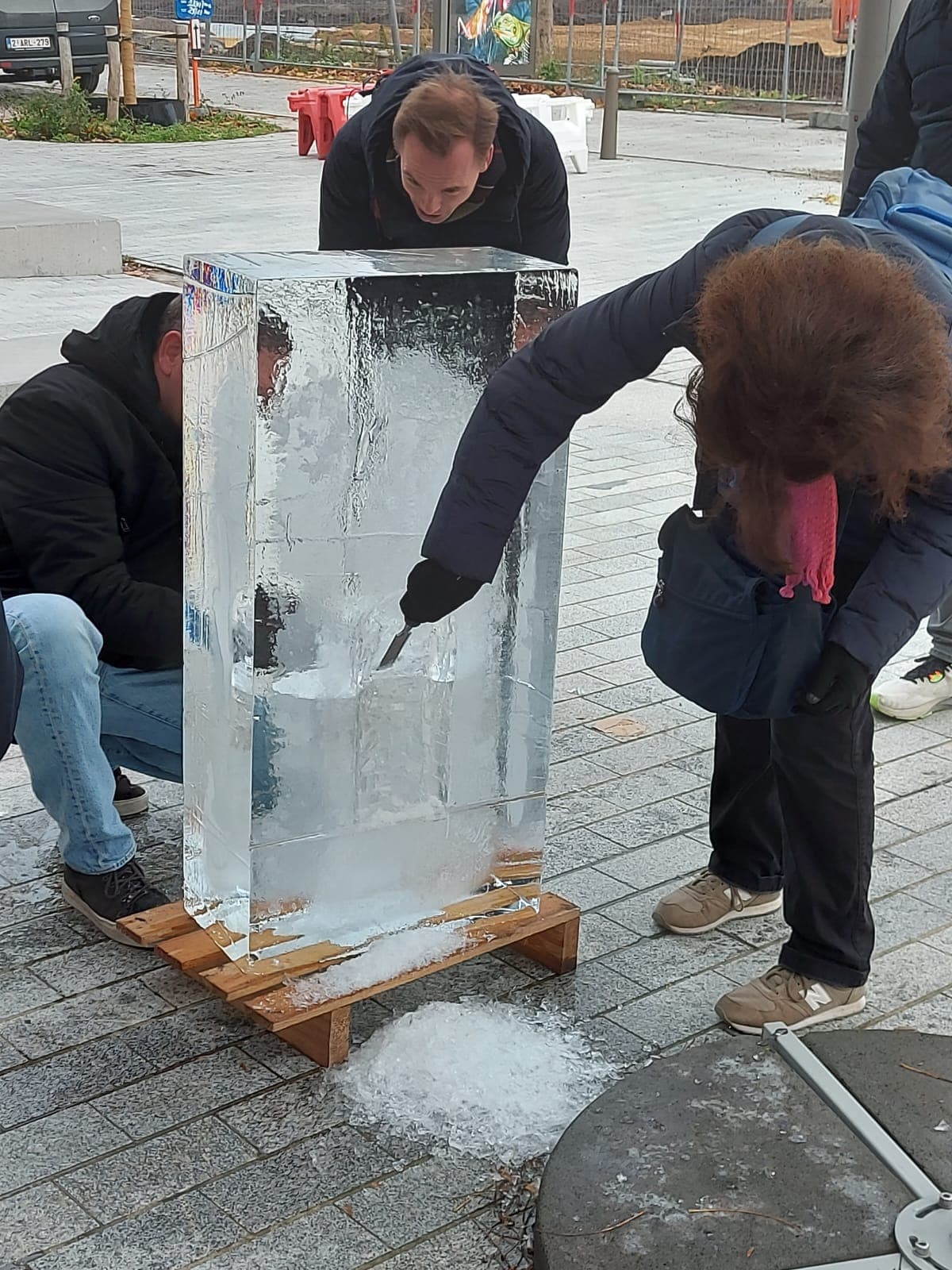 We delen de groep op in teams en elk team bewerkt in groep een massief ijsblok van 120 kg (100x50x25 cm).